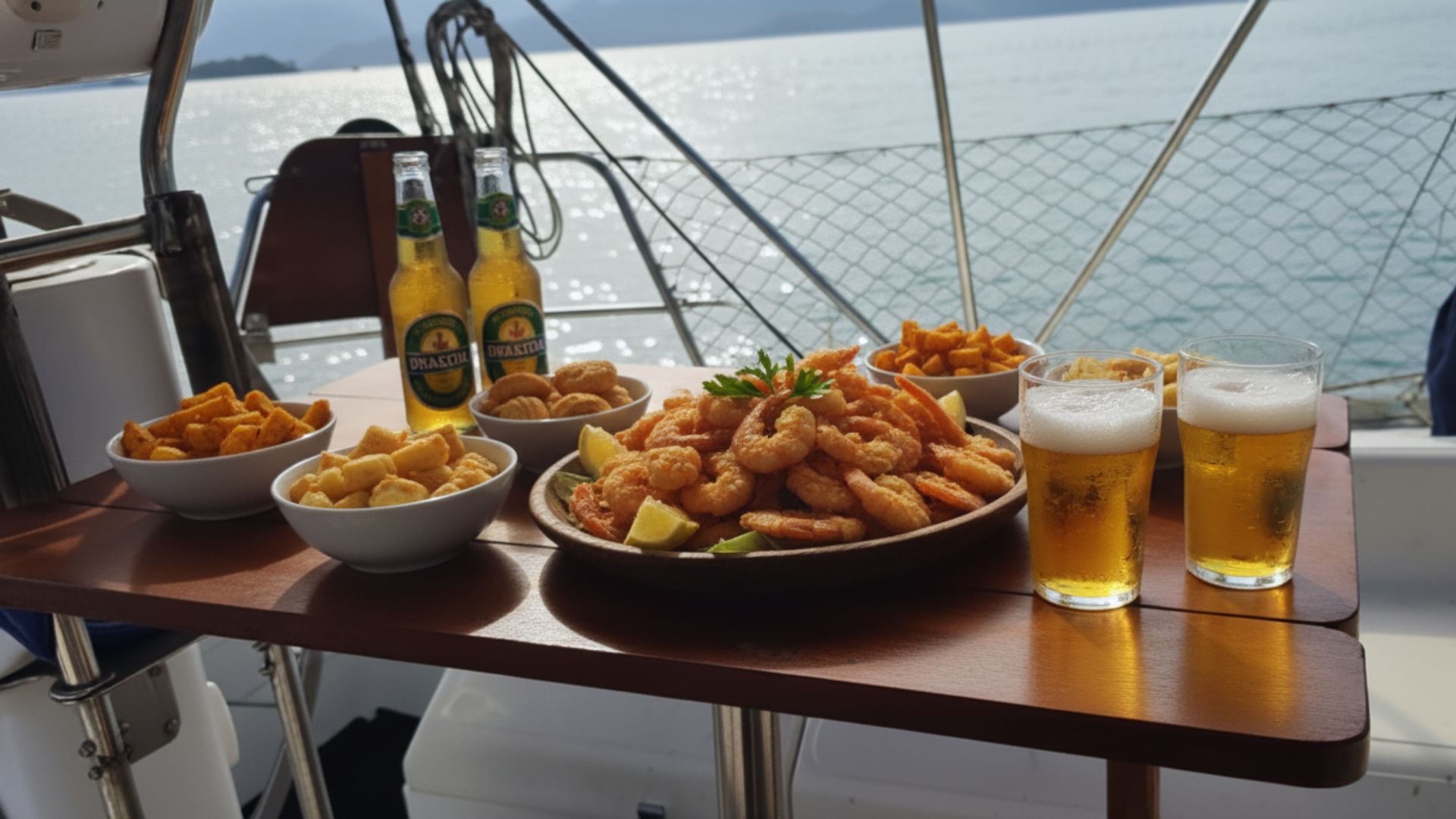 Você pode levar seus próprios alimentos e bebidas, mas não se esqueça do carvão e acendedor se for fazer um churrasco, o marinheiro será responsável por preparar e servir você e seus convidados, caso o grupo seja grande é interessante solicitar um ajudante para que o atendimento seja o melhor possível. Todos os barcos contam com geladeira ou cooler para as bebidas, micro-ondas e churrasqueira.