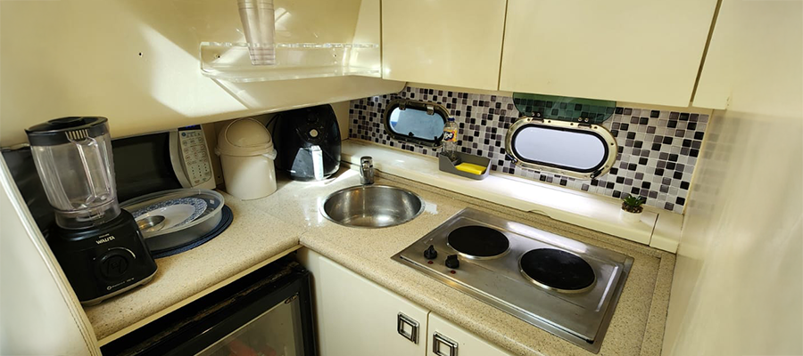 Você pode levar seus próprios alimentos e bebidas, mas não se esqueça do carvão e acendedor se for fazer um churrasco, o marinheiro será responsável por preparar e servir você e seus convidados, caso o grupo seja grande é interessante solicitar um ajudante para que o atendimento seja o melhor possível. Todos os barcos contam com geladeira ou cooler para as bebidas, micro-ondas e churrasqueira.