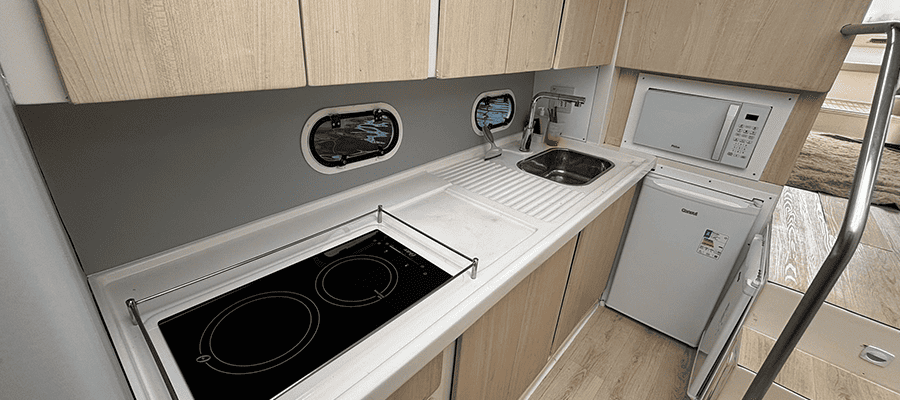 Você pode levar seus próprios alimentos e bebidas, mas não se esqueça do carvão e acendedor se for fazer um churrasco, o marinheiro será responsável por preparar e servir você e seus convidados, caso o grupo seja grande é interessante solicitar um ajudante para que o atendimento seja o melhor possível. Todos os barcos contam com geladeira ou cooler para as bebidas, micro-ondas e churrasqueira.