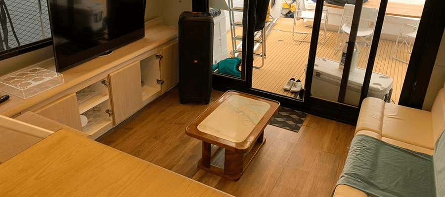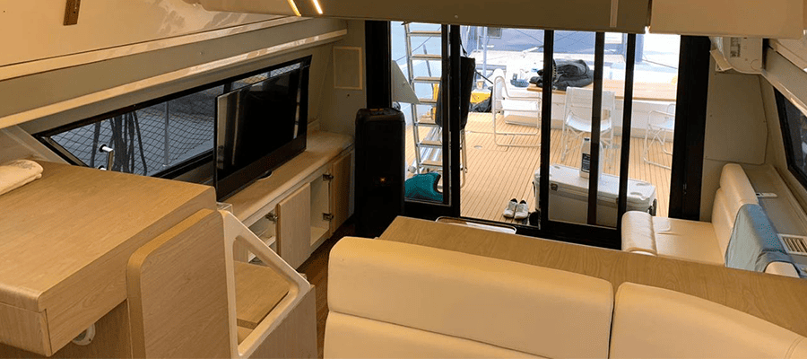 Não é permitido fumar a bordo, salvo em locais abertos como a popa (parte de trás) e no fly-bridge.
