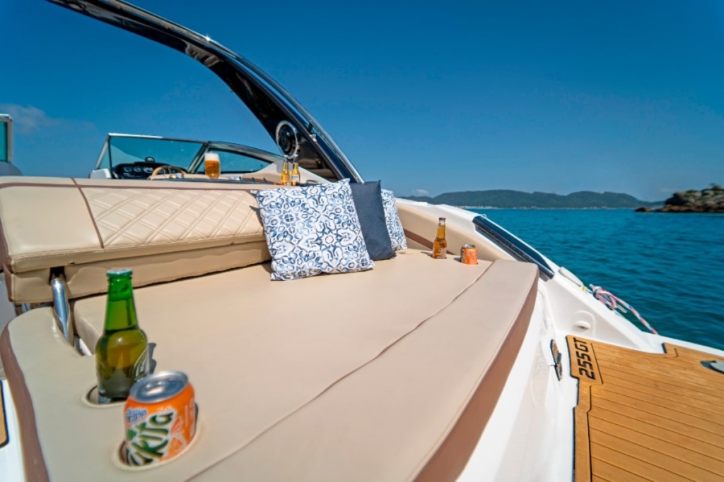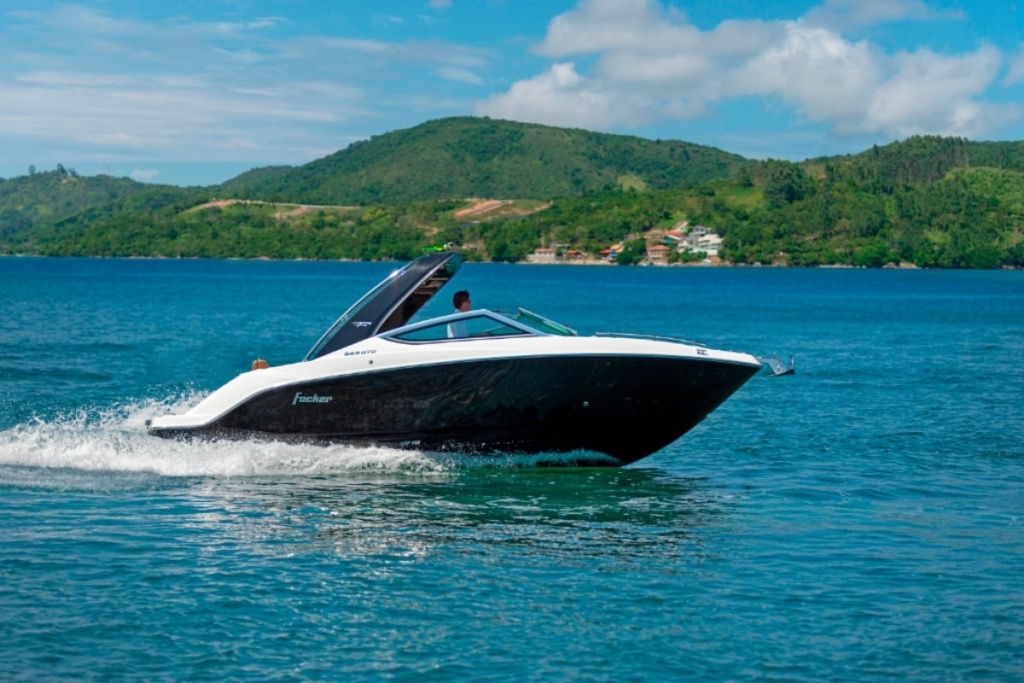 A Lancha Focker 255 é uma embarcação premium de 25 pés, reconhecida por seu design esportivo e acabamento de alta qualidade da renomada Fibrafort. Com capacidade para até 7 passageiros durante o dia e espaço de convivência amplo e ergonômico, esta lancha oferece proa aberta e banheiro fechado, garantindo privacidade e comodidade para toda a família.